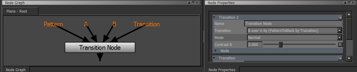 The value mapped to the 'Transition' Handle in the Nodegraph is used to Blend Value A and B
