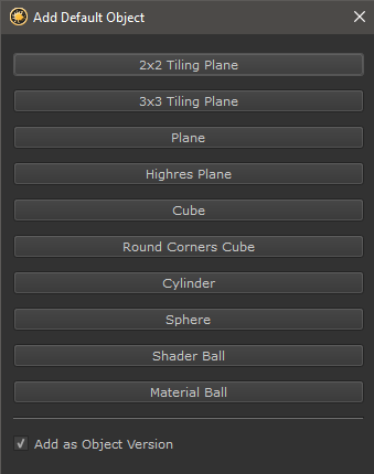 Add Default Object allows you to choose from several common default objects to add to your Mari Project.