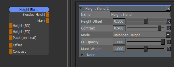 The Height Blend Node allows you to blend together two Height/Displacement or Bump maps. It is capable of outputting either