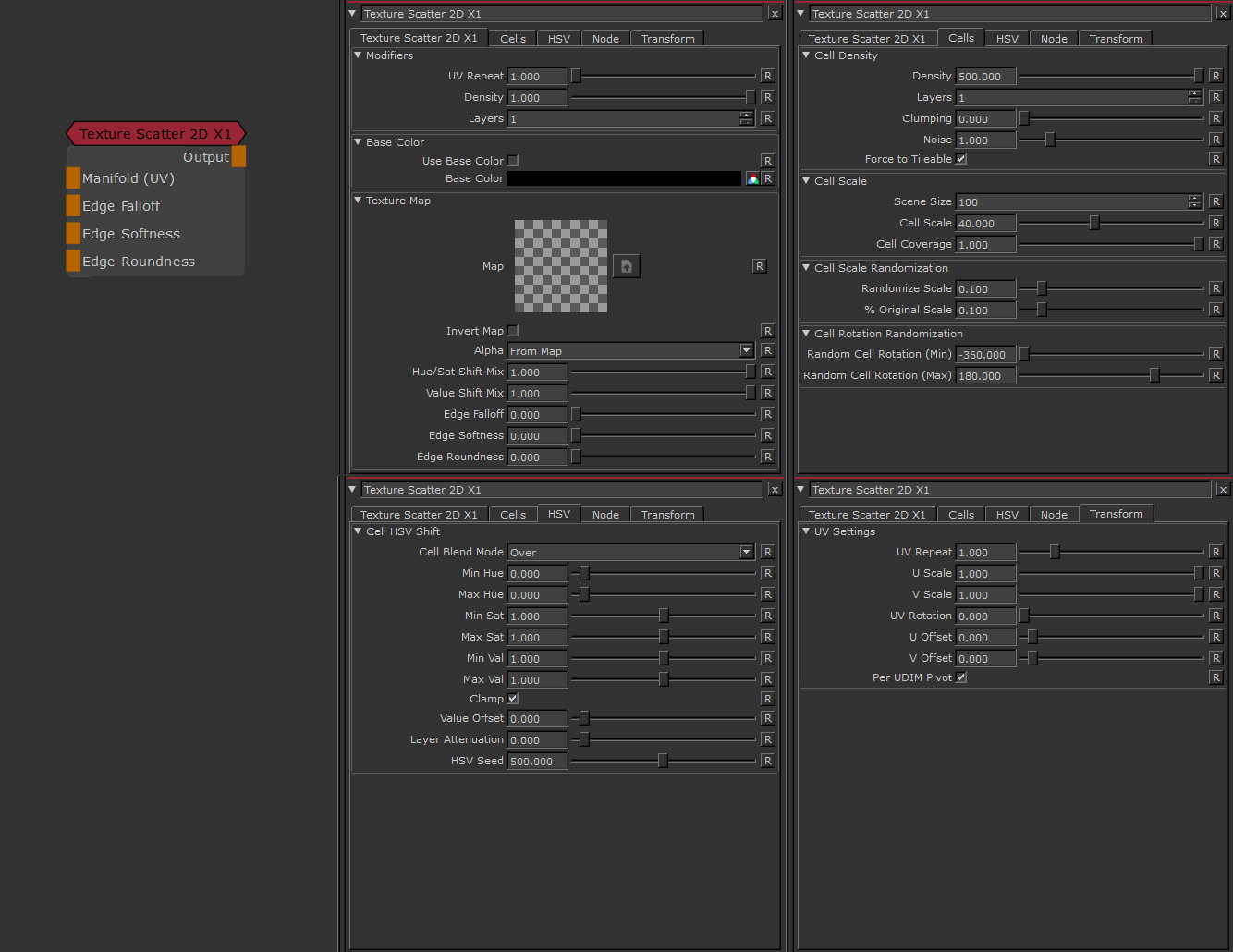 Texture Scatter 2D X4 is a complex texture bombing node, working in UV Space.