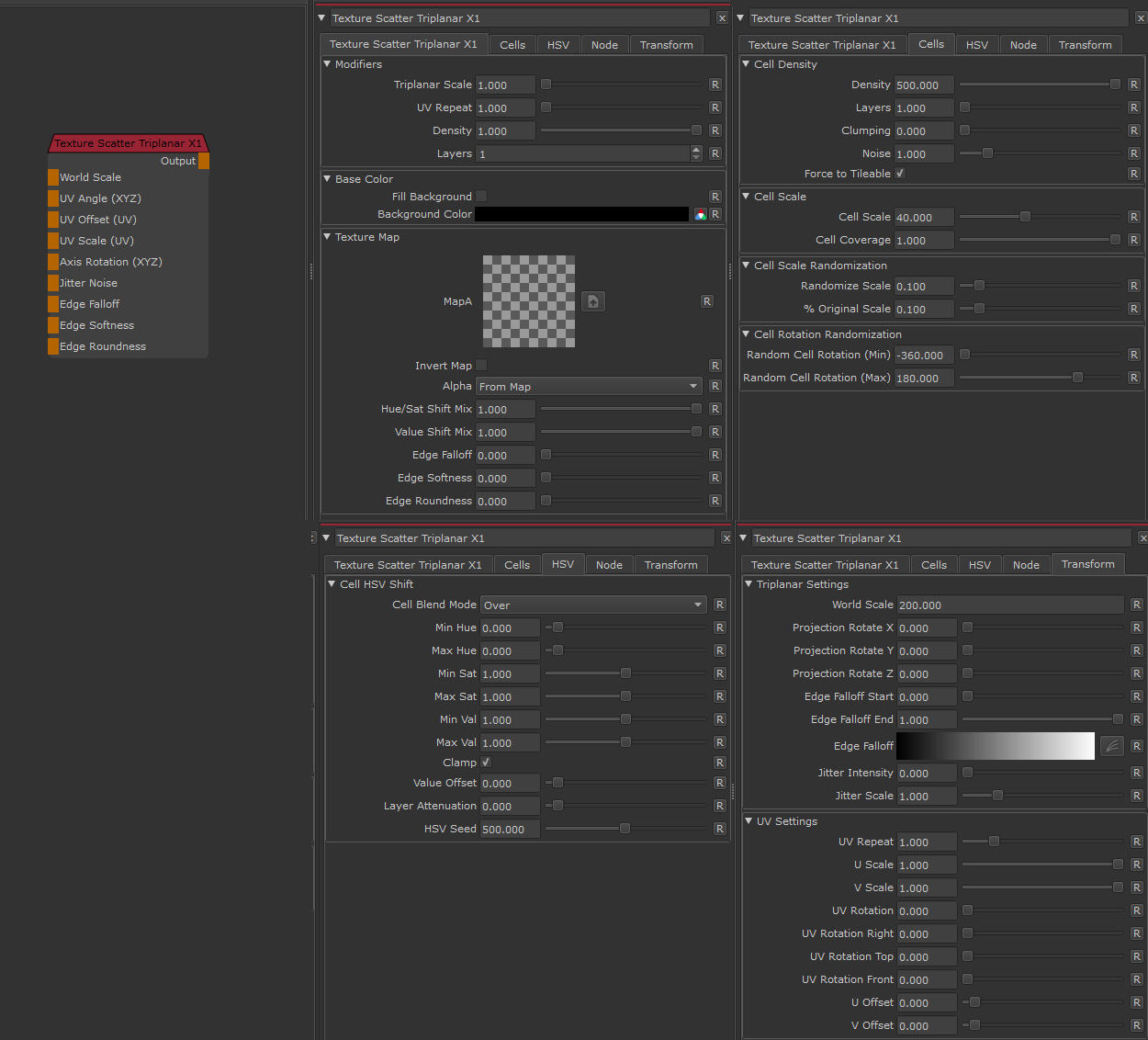 Texture Scatter Triplanar X1 is a complex seamless texture bombing node, working in 3D Space.