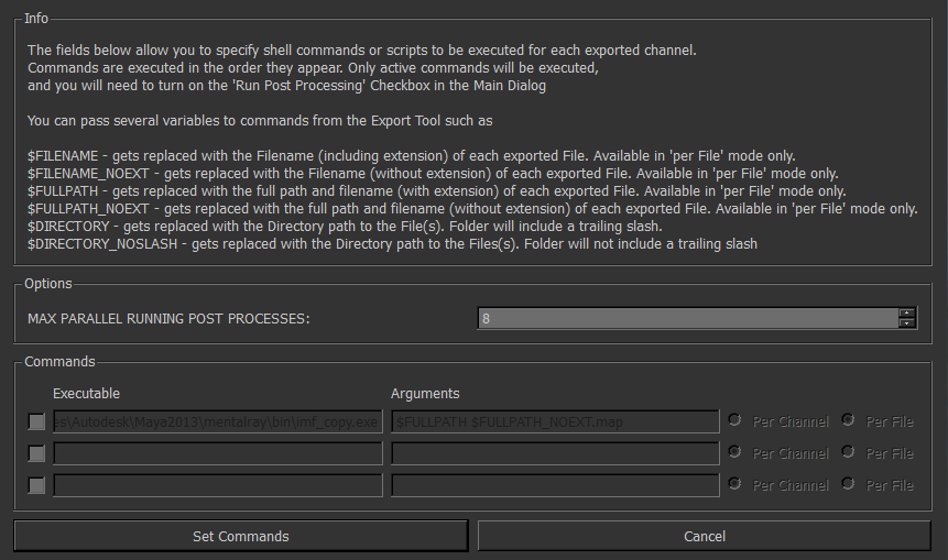 If the String $FILENAME is used in the Argument field it will be replaced with the full filename of each exported Texture.