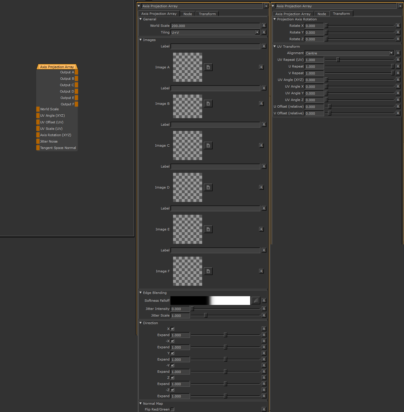 Axis Projection Array is a modification of the Extension Pack Axis Projection Node which is similar to a Triplanar projection but gives more control over projection orientation by isolating the positive & negative part of each axis.