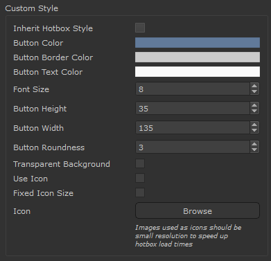 The Custom Style Group offers options to overwrite the style of a specific button so it is different than the style defined in the Hotbox Settings