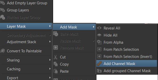 - If the selected layer does contain a mask or maskstack and only one channel layer is added, it will be set to Blendmode 'Multiply'. If 'Invert' was on during Channel Layer creation, the channel layer and invert adjustment will be grouped to prevent existing maskdata from being inverted.
