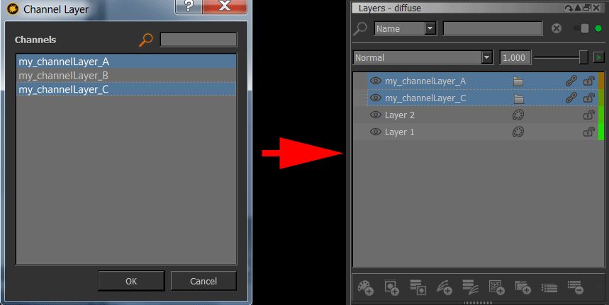 - If the selected layer does contain a mask or maskstack and multiple channel layers are added, they will be grouped first with the group's Blendmode set to 'Multiply'. ChannelLayers will then be added to the Group with the first one at Blendmode 'Normal', subsequent ones at Blendmode 'Screen'.