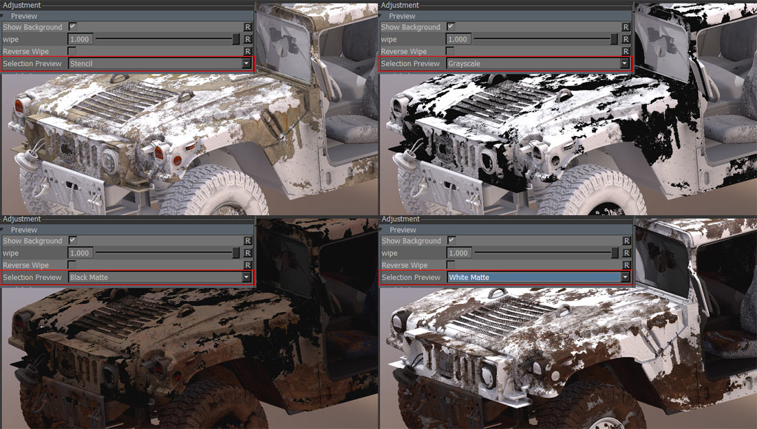 When Grade Mode is checked, all options under the 'preview' group ('show background', 'wipe', 'selection preview') will be ignored |