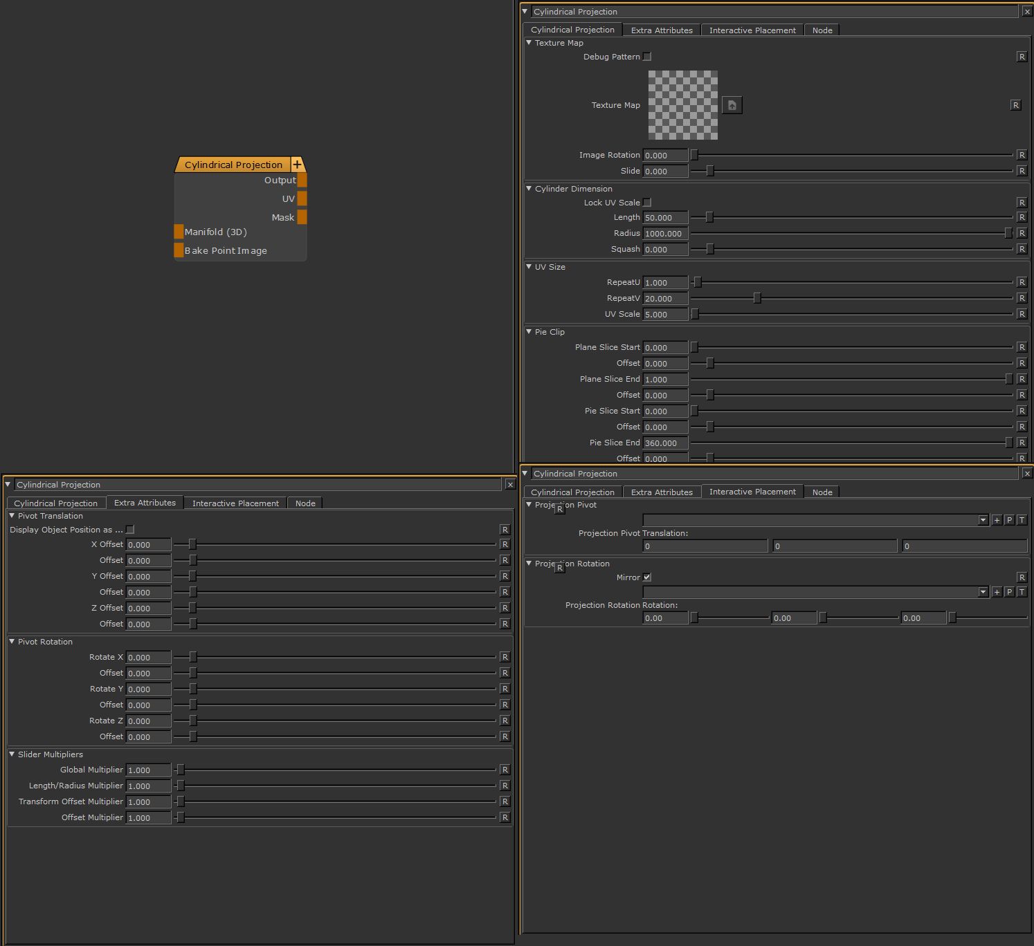 - Generate your Cylindrical Projection Node and open group 'Pivot Translation' under the 'Extra Attributes' Tab