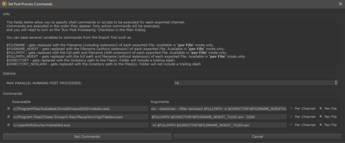 If the String $FILENAME is used in the Argument field it will be replaced with the full filename of each exported Texture.