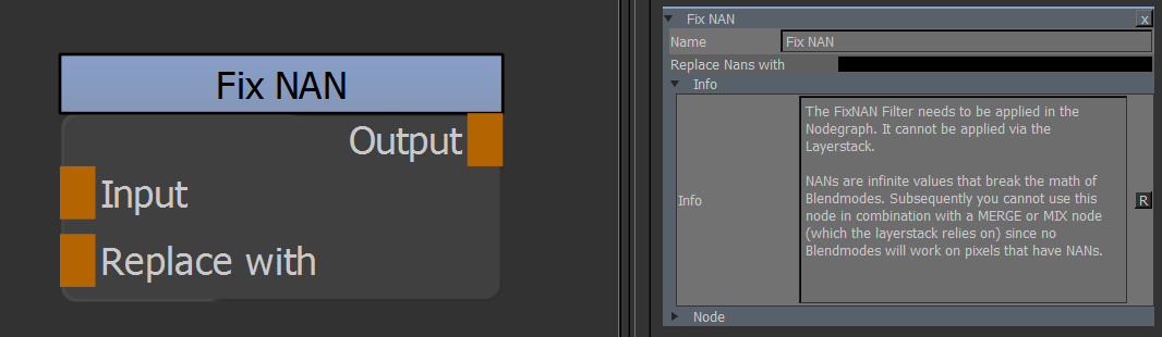 Node needs to be used in the Nodegraph The FIX NAN Node Adjustment needs to be hooked in via the Nodegraph. NANs break any blending mode math therefore the Node will not fix any bad pixels when used in the Layerstack. |