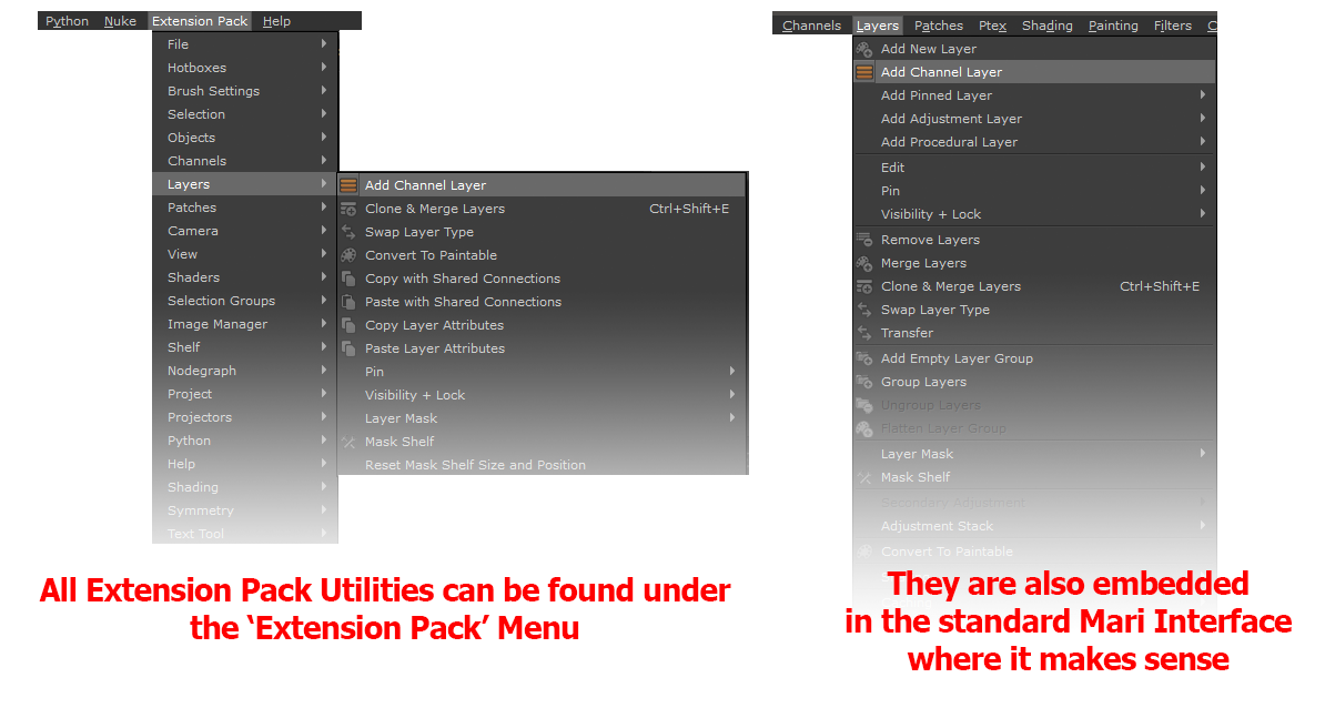 The sub menus in the "Extension Pack" Menu echos Default Palette & Menu structure.