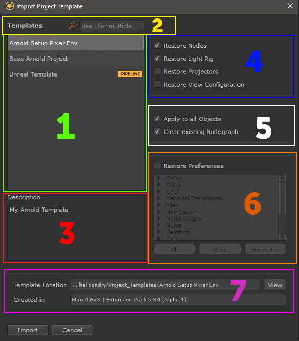 - On top of project specific data such as Nodes, Lights etc., Templates also save a Snapshot of your Mari Preferences found in the Edit Menu.