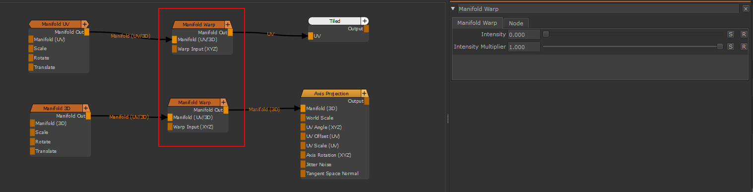Warping can be performed on UVs or 3D Position Data depending on what is fed into the Manifold port of the Node |