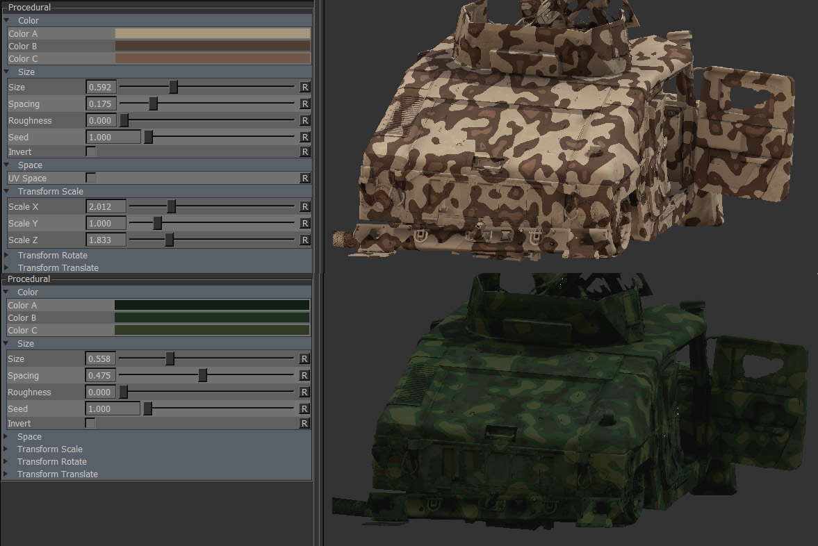 The 3 Colors that make up the Camouflage Pattern. ColorA is the 'background', B & C the pattern.
