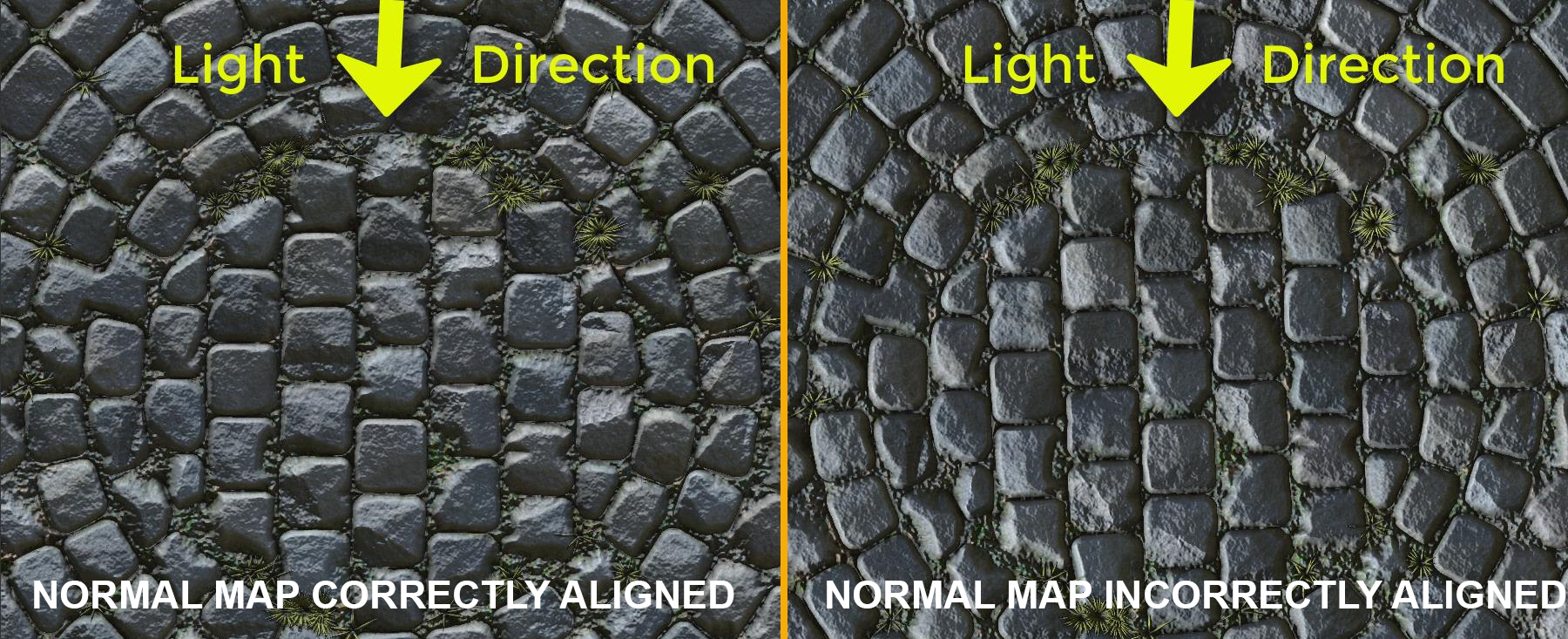 Below you can see an example of the effect of an incorrectly aligned normal map, where the original material/normal map was rotated 90 degrees inside of Mari