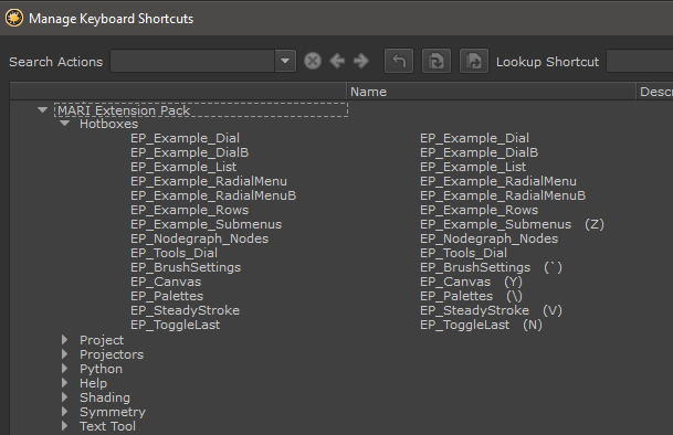 Hotbox Hotkeys can also be defined via the Mari Shortcut Editor available in the Main Window's Edit Menu.
