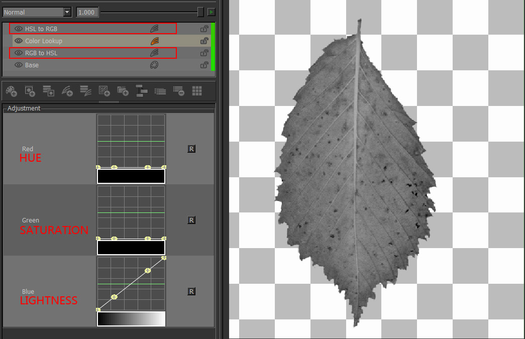 3) In the Image below the Red, Green and Blue Channels were converted to Hue/Saturation & Lightness first, changed via