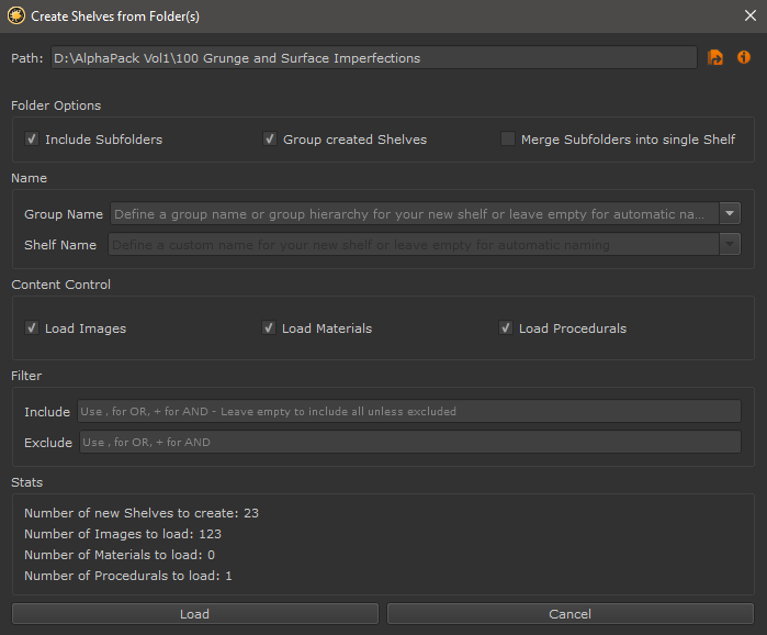 If checked, the contents of Subfolders of the supplied Path will be placed into a single Shelf with the Name of the Base Folder.