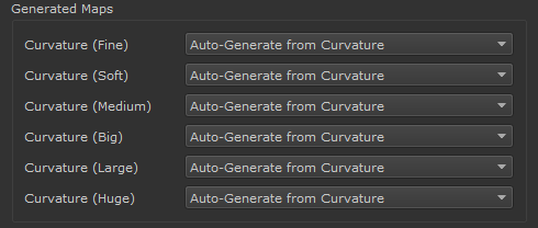 Generated Maps are variations of the Curvature Map supplied in the Baked Maps Section of the Dialog.