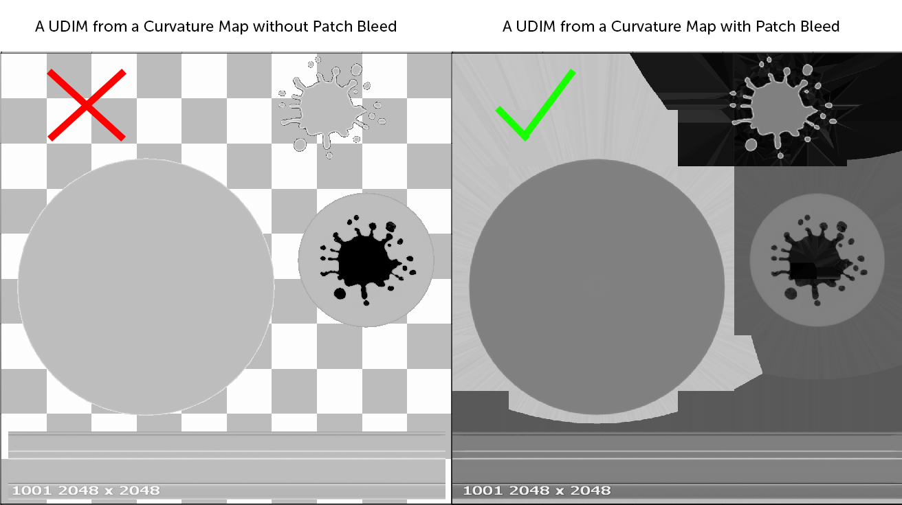 For best results ensure Curvature Maps have had Texture Dilation applied by opening the Mari Patches Menu and choosing the Bleed Patch Edges Option or ticking on the Apply Patch Bleed to Curvature in the dialogs Curvature Options |