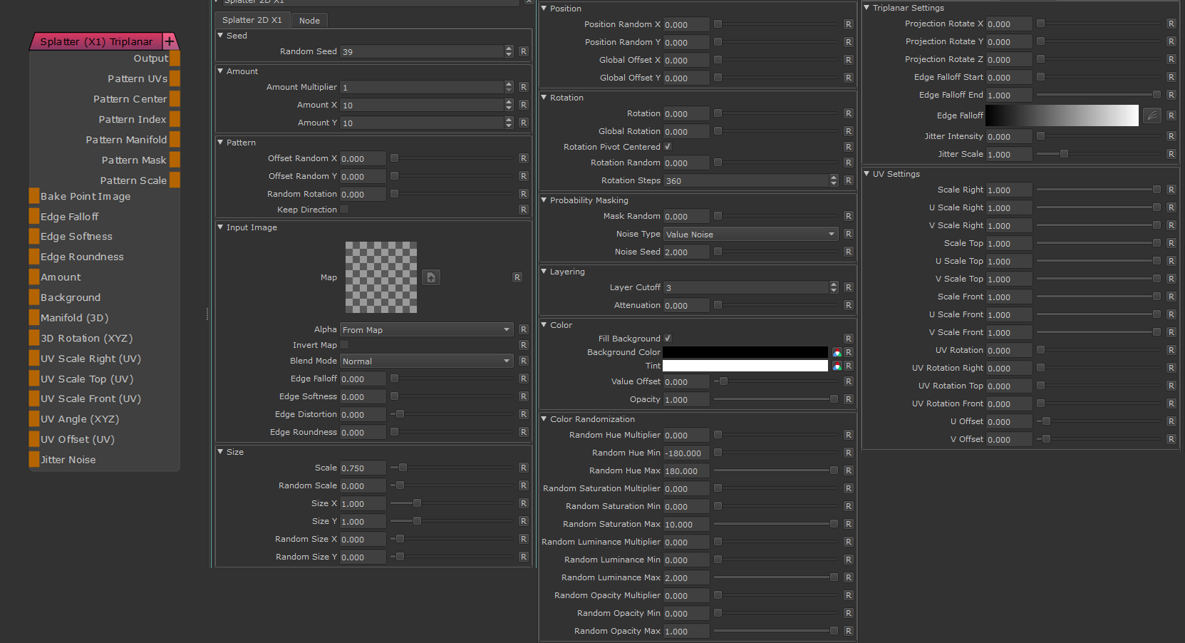 Designed for creating random patterns, Splatter nodes allow Texture Bombing with 1 Texture Input