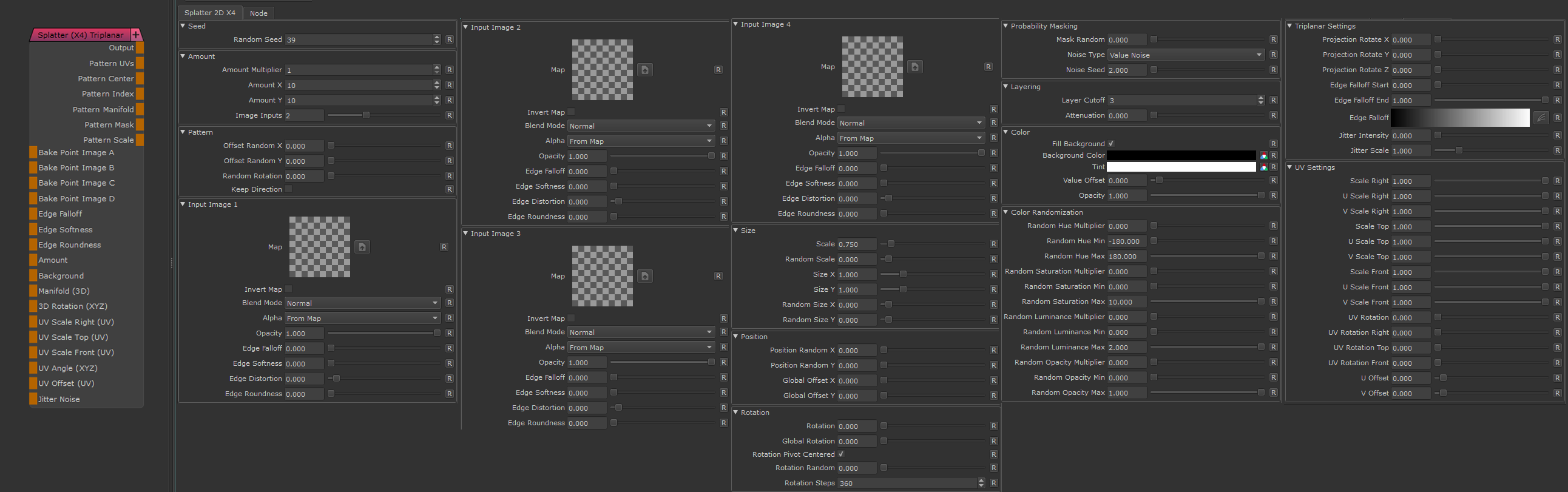 Designed for creating random patterns, Splatter nodes allow Texture Bombing with up to 4 Texture Inputs