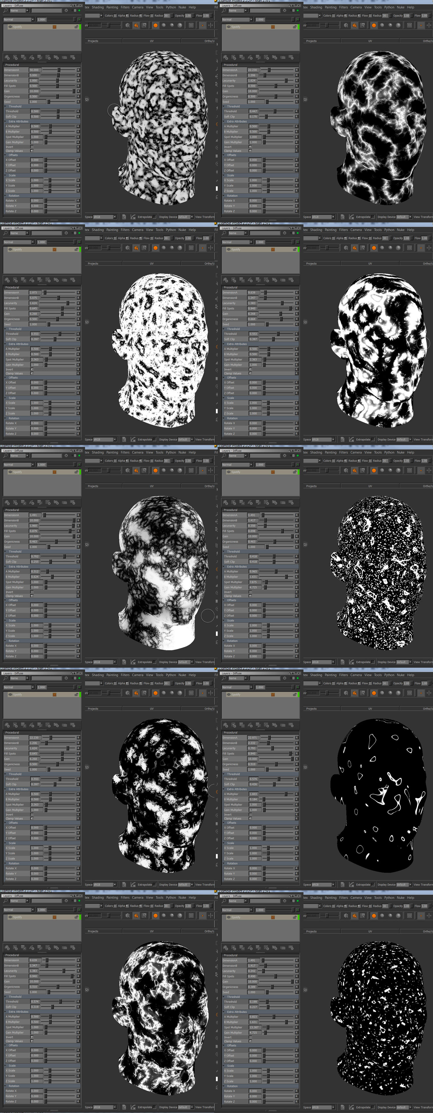 Fill Spots represents the exponent in an exponentiation with itself, widening (high values) or sharpening (low values) the created 'ridges' of the noise: