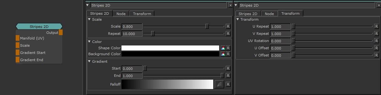Stripes 2D creates Line Patterns. Generation is done based on UV Space so there will be seams between tiles and uv shells.