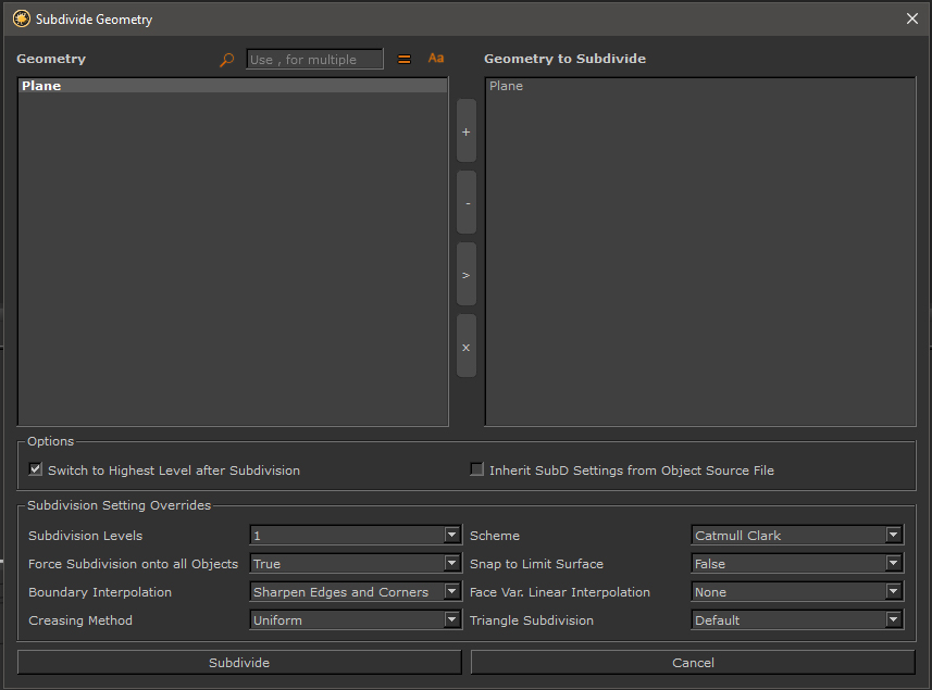 Subdivide when launched via the Menu / Objects Interface Entry allows you to batch subdivide multiple objects