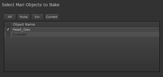 The Mari Objects List allows you to select which Mari Objects should be calculated during the Baking process.