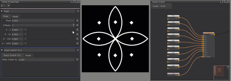 Example of an Input Switch Node with 'Stepping' of 1 controlled by a Float Node.