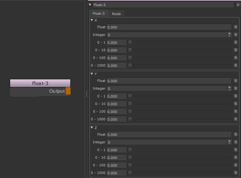 The Float-3 Node allows you to set separate R, G and B Values per Channel with a variety of different UI controls.