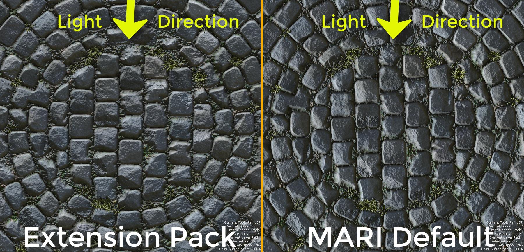 • MARI's default nodes on the right will not compensate for the normal map orientation, resulting in dramatically wrong lighting in viewport & render