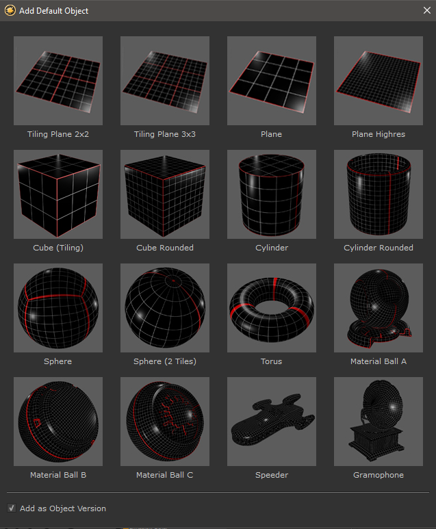 Add Default Object allows you to choose from several common default objects to add to your Mari Project.