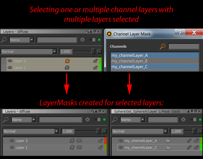 - If the selected layer does not contain a mask or maskstack and multiple channel layers are selected the first added channel layer in the mask stack will be set to Blendmode 'Normal', subsequent ones to Blendmode 'Screen'