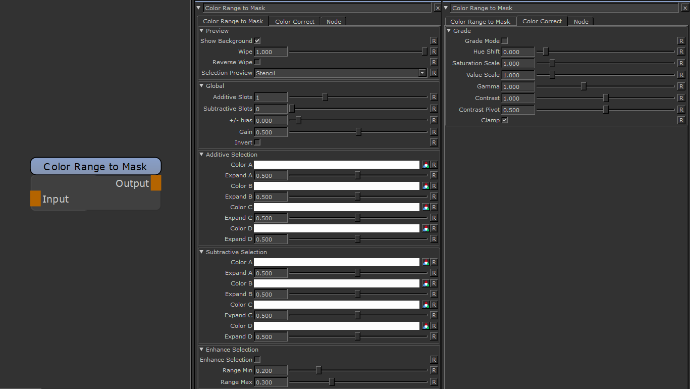 With Grade Mode activated the Color Range to Mask Node becomes a fully functional selective color corrector.