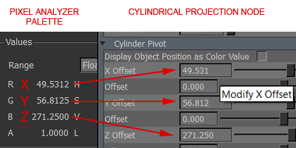 - Transfer the RGB Values from your Pixel Analyzer Palette into X,Y and Z Offset of the Cylindrical Projection and turn off
