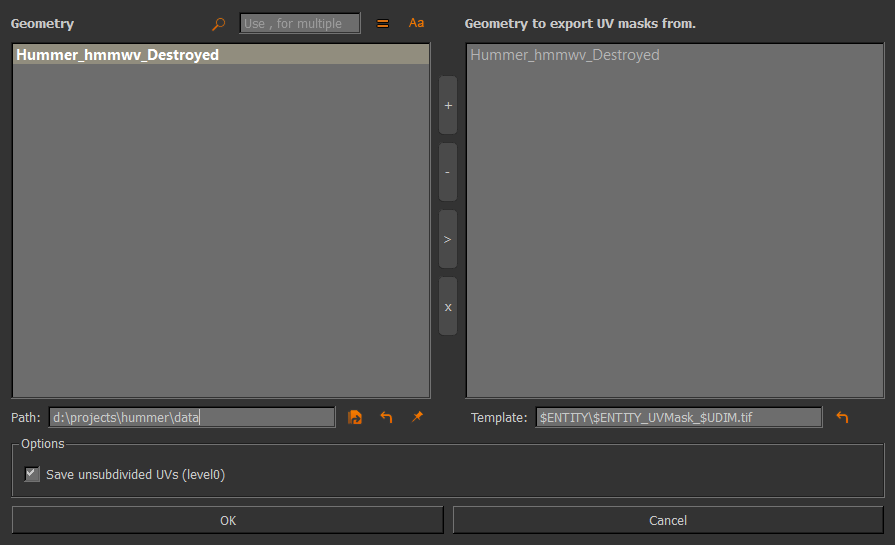 If launched via the Object Menu you can choose what Geometry to export the UV Masks from or