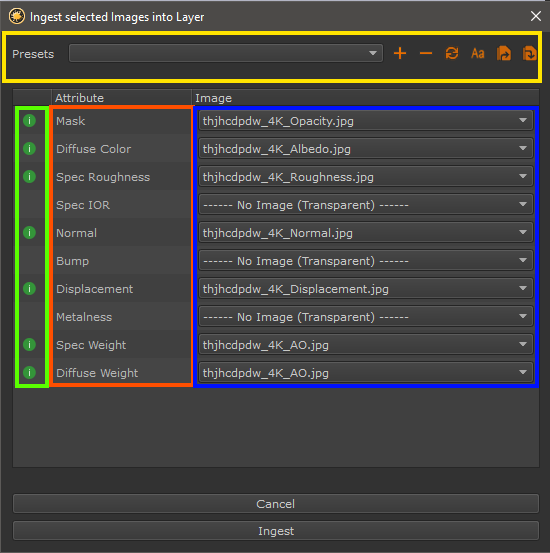 The Ingest Tool allows you to directly assign multiple selected images to a selected Layer or Node, if the Layer/Node accepts Image Attributes.