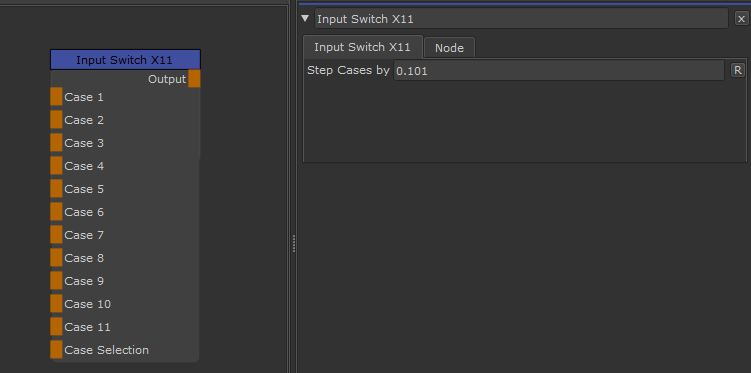 The Input Switch will switch between 11 Inputs based on a step value provided by the 'Case Selection' Connection