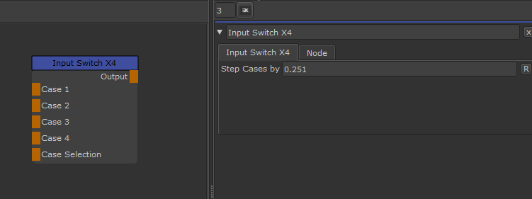 The Input Switch will switch between 4 Inputs based on a step value provided by the 'Case Selection' Connection