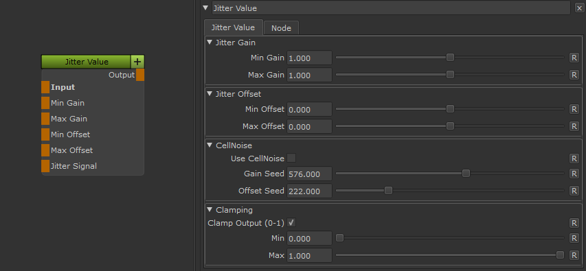 The Jitter Value Node allows you to gain and offset an input value randomly based on a supplied signal value