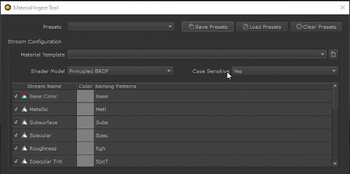 - In the Mari Material Ingest Tool found in the Tools Menu, select a preset from the Material Template dropdown