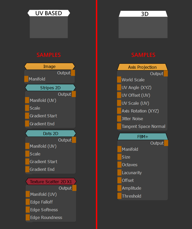 The shape of a node will communicate if it is a 3D node (seamless) or UV Based Node (2D):