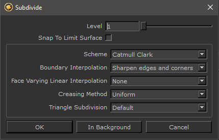 Increased Subdivision Levels Compared to Mari's default Subdivision Dialog, the maximum Subdivision in Extension Pack has been increased from 3 to 7 |