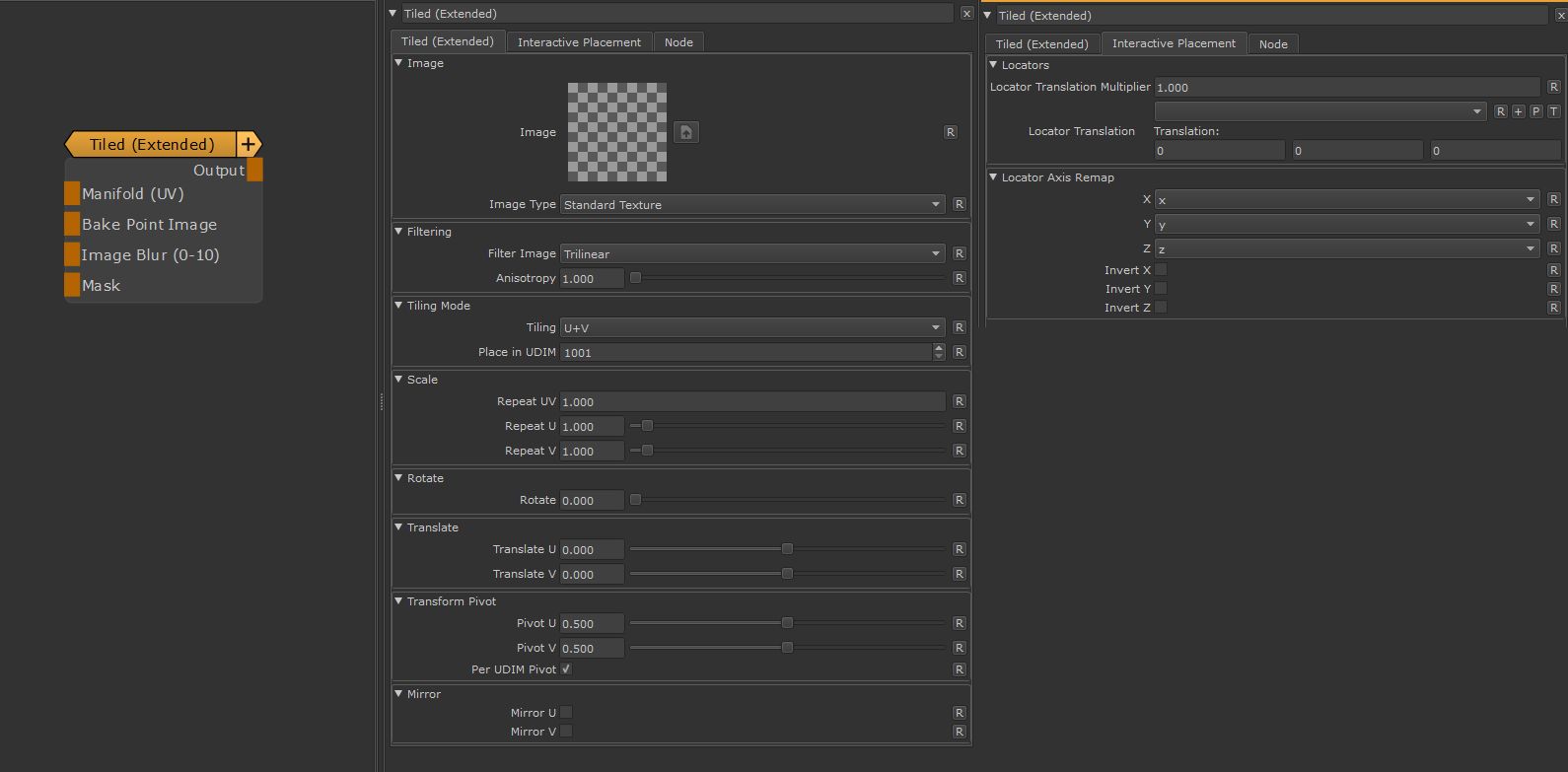standard Mari 'Tiled' Node and offers similar capabilities when used in the Layerstack as the combined Image/Manifold
