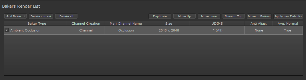 The Baker Render List allows the user to add any number of Bakers that will be executed sequentially one after another.