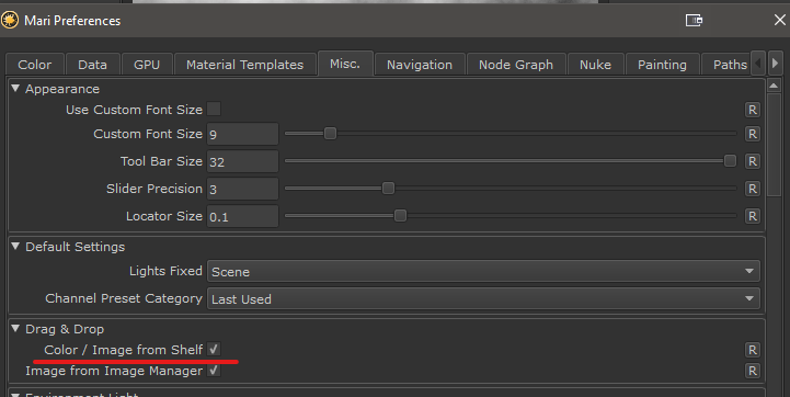 All the different behavior shown above can be disabled via the Color/Image from Shelf Option in the Misc Tab of the Mari Preferences